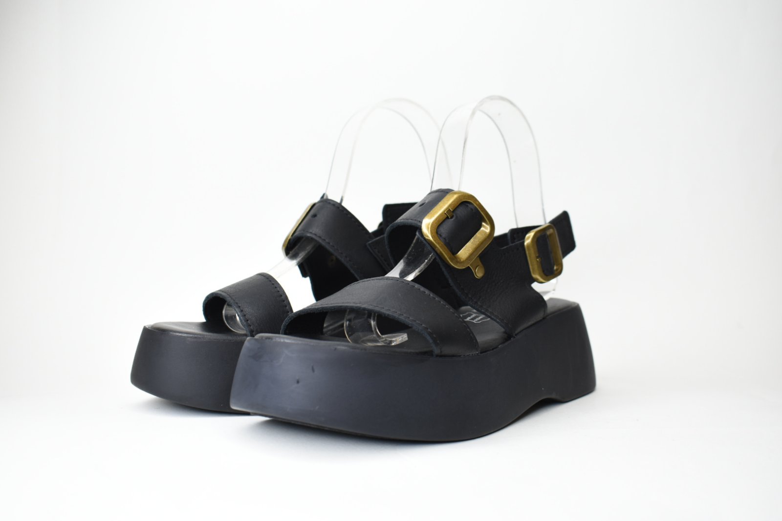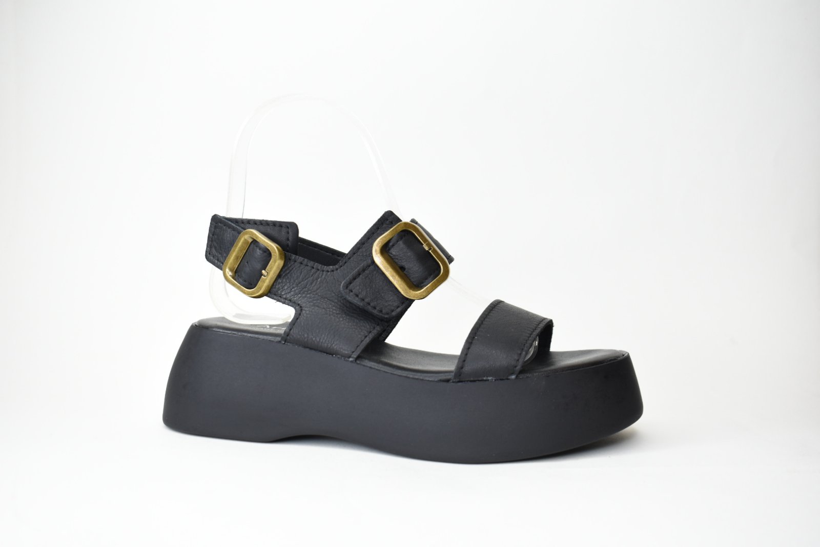 Χειροποιητα Δερματινα Flatform Πεδιλα με Διπλη Baretta και Μεταλλικες Τοκες στο Κουτεπιε Σχεδιο 94592 Μαυρο/Black