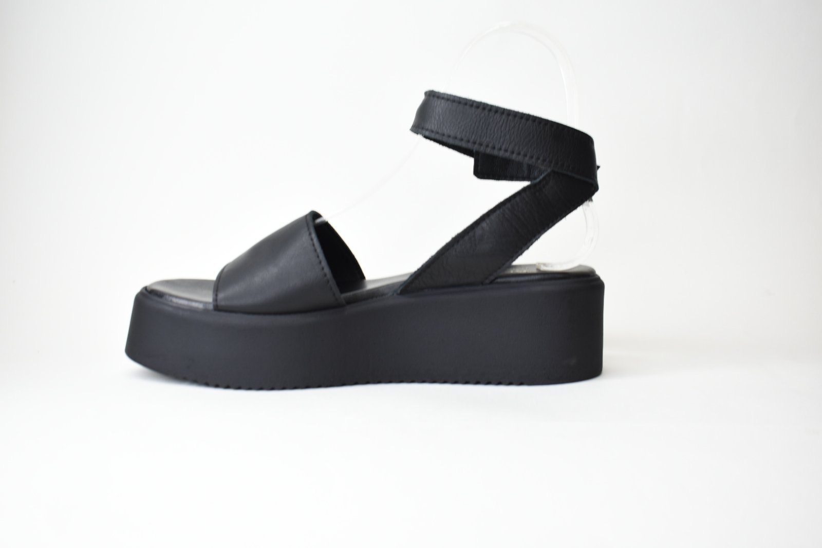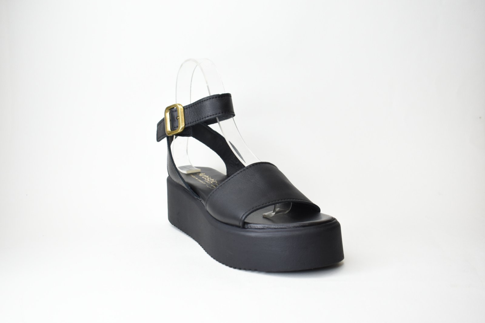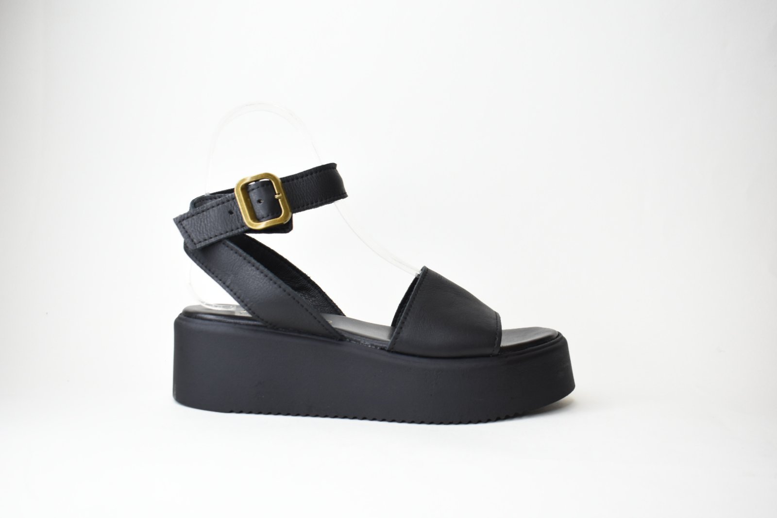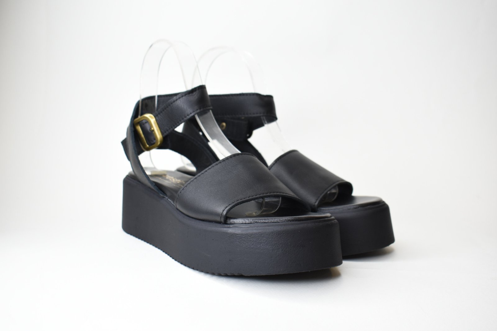 Χειροποιητες Δερματινες Πλατφορμες με Διπλο Λουρακι και Χαλκινη Τοκα Σχεδιο 94602 Mαυρο/Black